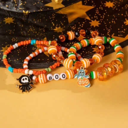 Women’s Halloween Beaded Bracelet Set – Colorful Stretch Stackable Bangles with Pumpkin Ghost Charm for Party, Cosplay and Nightlife
