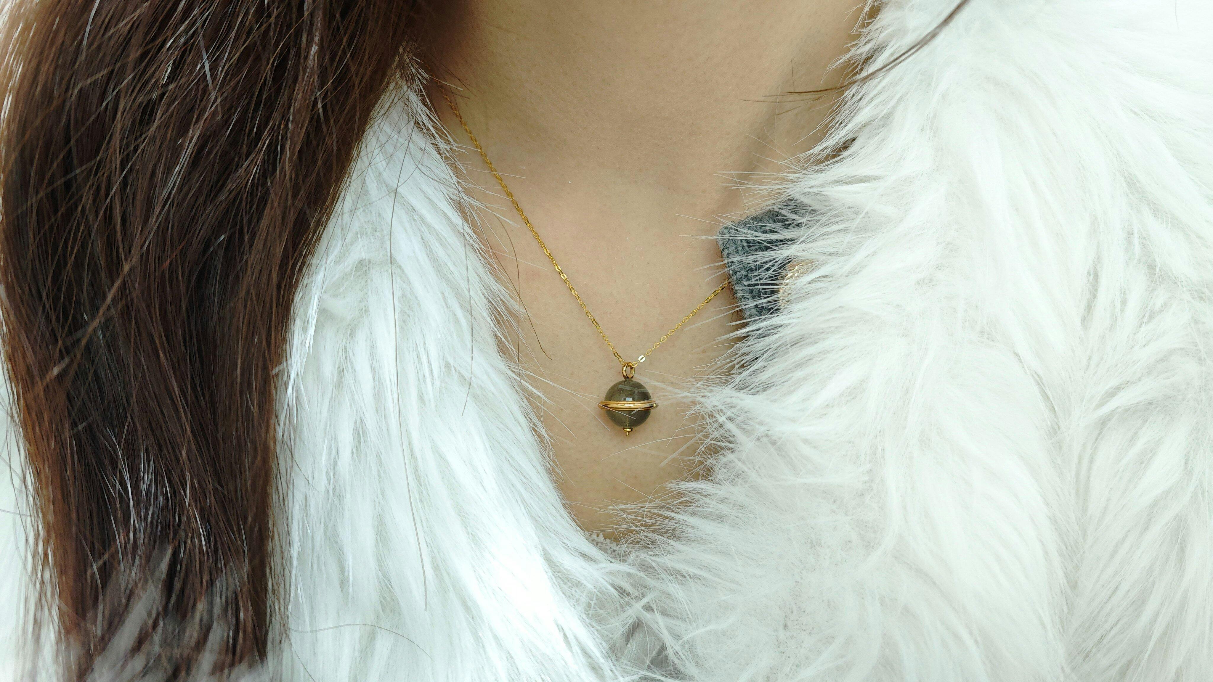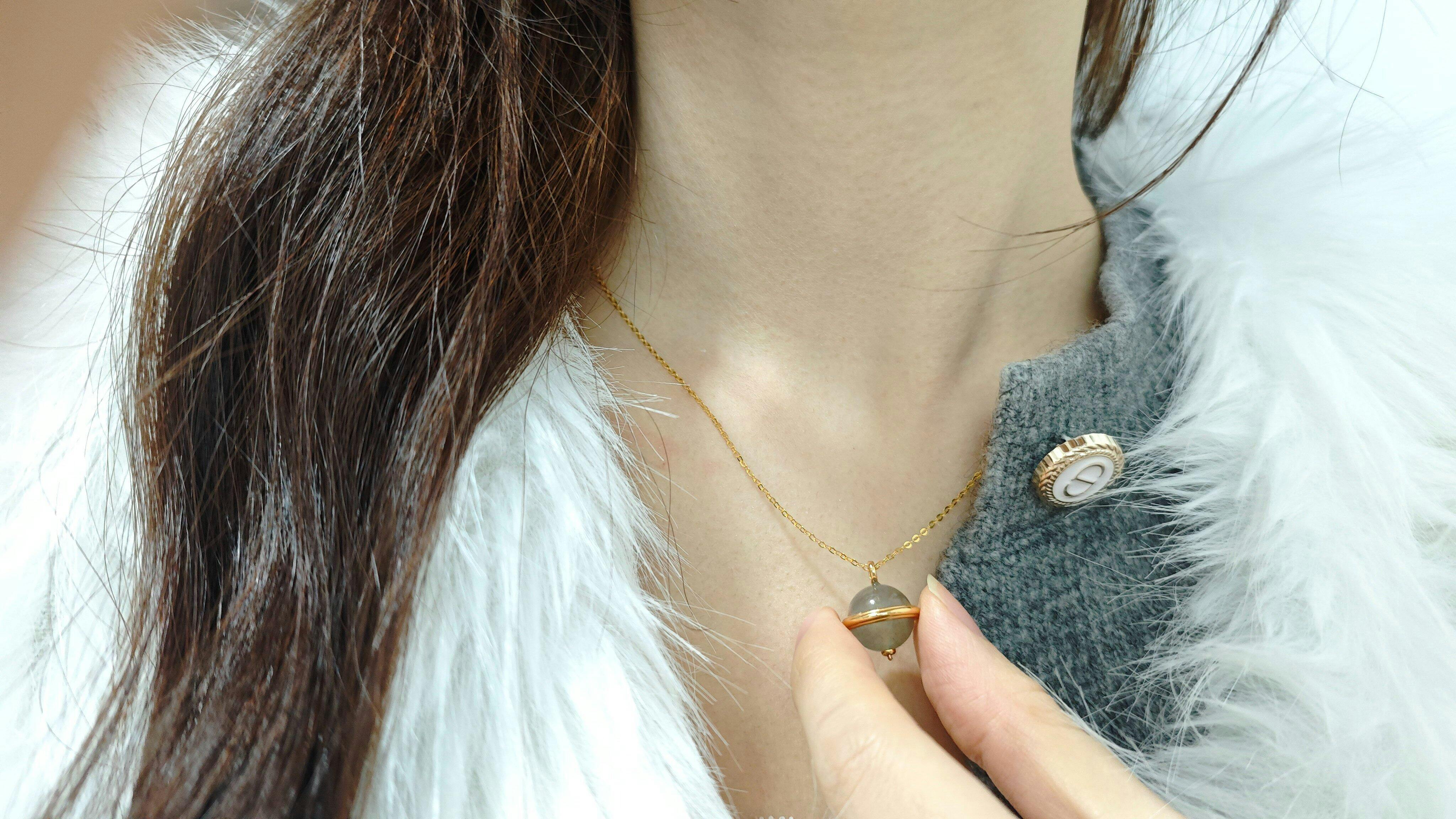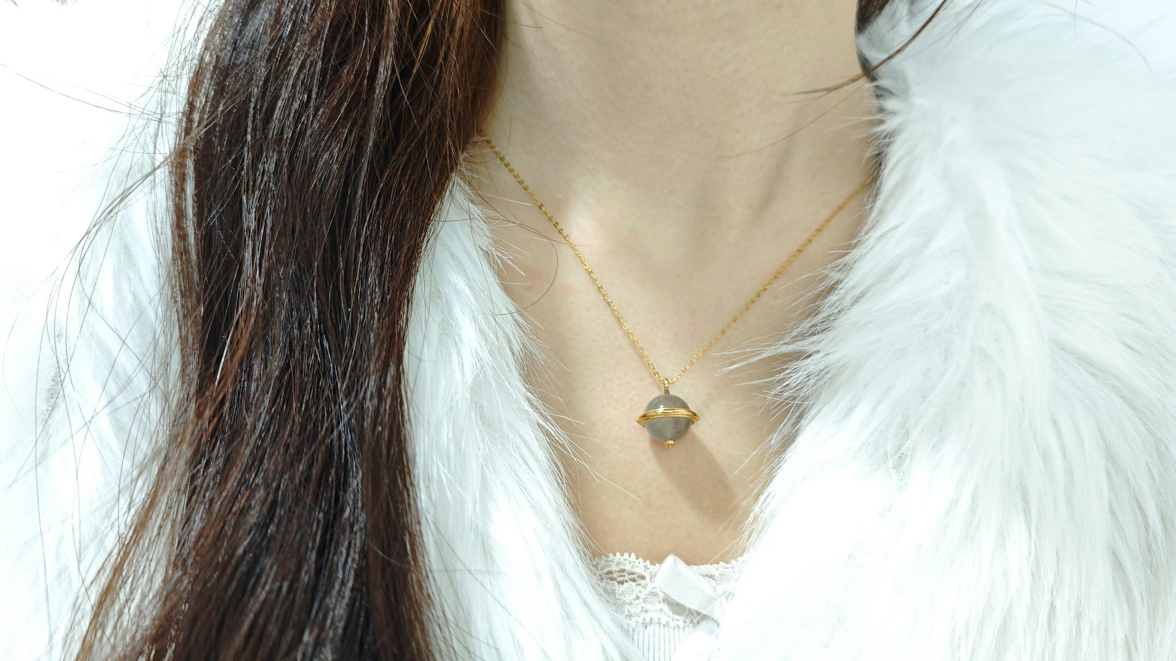 这款项链的设计灵感源自天体行星,将宇宙的神秘感融入设计之中。灰色宝石象征着行星,金色圆环勾勒出行星的运行轨迹。将浩瀚宇宙的浪漫凝结于颈间,开启一场个性化的星际之旅。