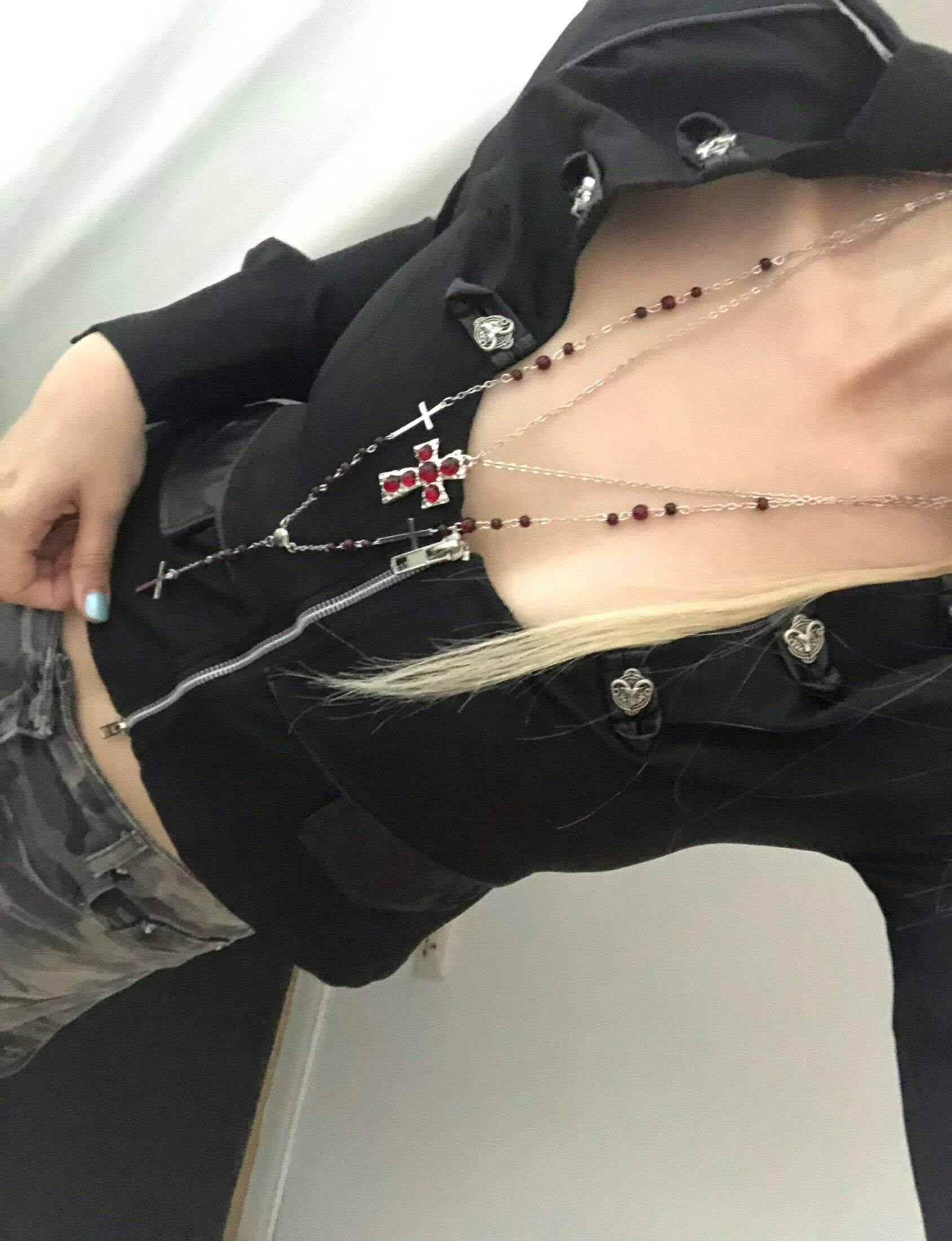This layered cross necklace is a stunning fusion of Gothic and retro styles. Featuring multiple chains and a simple cross as a backdrop, the cross is decorated with a red gemstone in the middle. Adding a touch of mystery and depth to the whole. Very suitable for enhancing avant-garde clothing or adding bold religious style to your appearance, it effortlessly combines rebellious spirit with complex details.