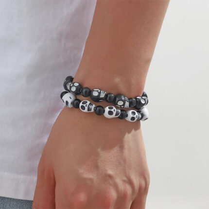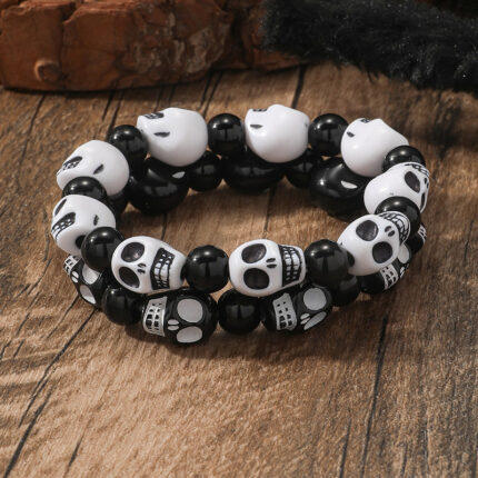 2pcs White & Black Smiling Skull Head Stretch Bracelets Set